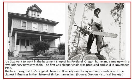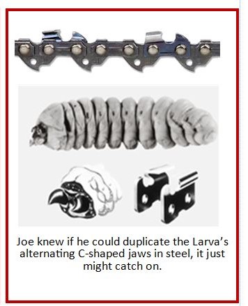 Logger / Inventor Joseph Buford Cox was chopping firewood one autumn day in 1946 when he paused to examine curious activity in a tree stump. A timber-beetle larva, the size of a mans forefinger was easily chewing its way through sound timber, going both across and with the wood grain at will. Joe was an experienced operator of the gas-powered saws used in those days, but the cutting chain was a problem. It required a lot of filing and maintenance time. "I spent several months looking for nature's answer to the problem." Joe recalled. 'I found it in the larva of the timber-beetle."